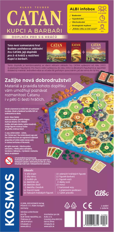 Rozšírenie Catan - Kupci a barbari pre 5 – 6 hráčov (edícia 2025) vám umožní zdieľať nové dobrodružstvá na ostrove Katan s ešte väčšou skupinou priateľov či rodiny. Táto nová edícia prichádza s modernizovaným vizuálom a vylepšenými komponentmi, ktoré sú plne kompatibilné s plastovou verziou základnej hry aj ostatných rozšírení.